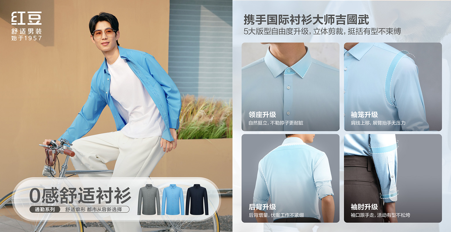 2025年,联合国际衬衫大师吉國武共同打造的匠心之作红豆0感舒适衬衫3.0,对Flexpand版型进行了四大升级。拱桥型领口解放颈部,活动无束且更耐脏;通过肩线上移与后背增量设计,实现抬手自如,大幅提升活动灵活性;肘部特殊褶裥处理,保障伏案工作时毫无紧绷感;自贴合袖口能随手腕活动自动调节,时刻保持最佳状态。